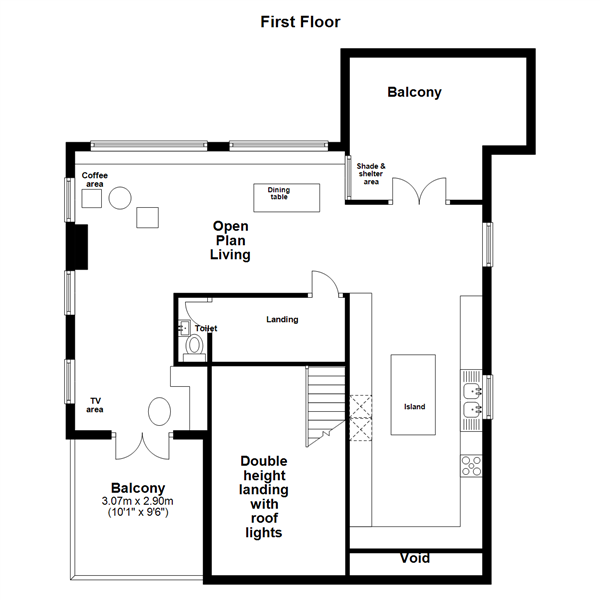 The rear glazing could incorporate window seating along it’s full length giving flexibility for dining & socialising; whilst the area to the front of the property would be a cosy but light filled living area with a door leading to a balcony where the current flat roof is unused.