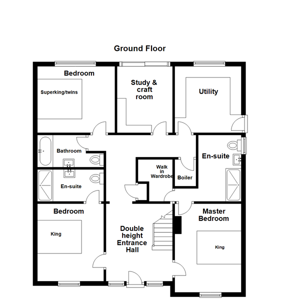 On the ground floor, the staircase could be relocated to the front entrance hall with a dramatic double height sloping roof with skylights, replacing the current flat roof. This would allow for a good sized walk-in wardrobe to take the space left by the old stairs.